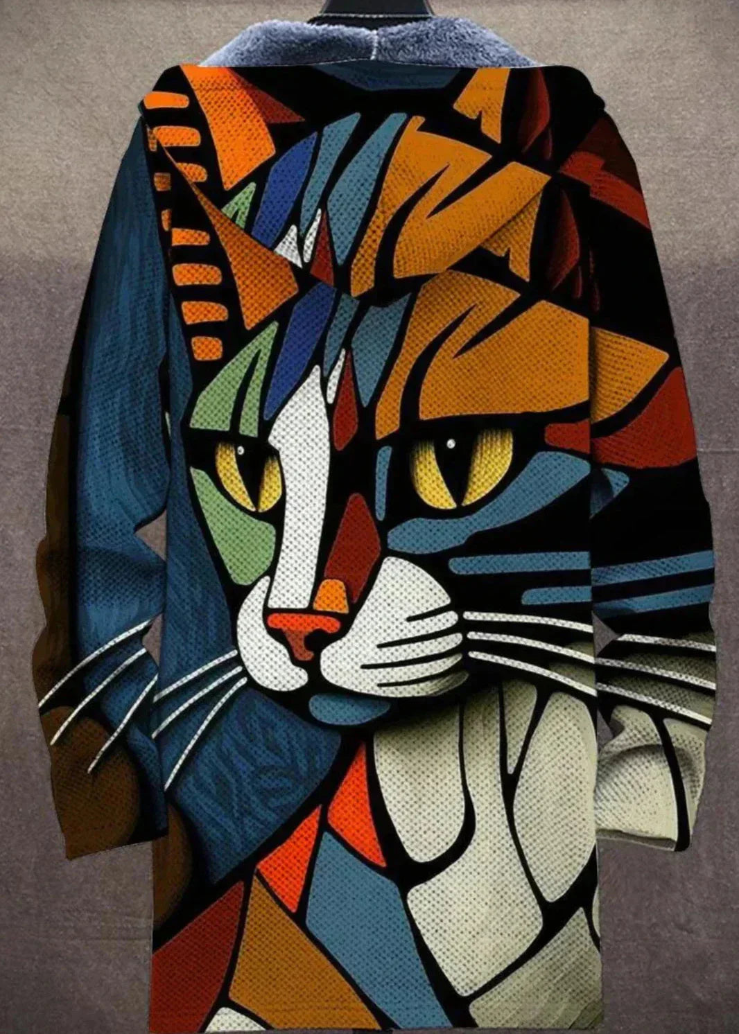 Einzigartiges Katzen-Design: Das farbenfrohe und künstlerische Motiv sorgt für einen mutigen, auffälligen Look, der alle Blicke auf sich zieht.